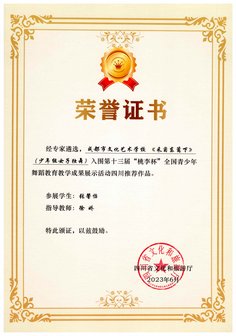 2023年6月,独舞《采菊东篱下》入围第十三届“桃李杯”全国青少年舞蹈教育教学成果展示活动四川推荐作品;
