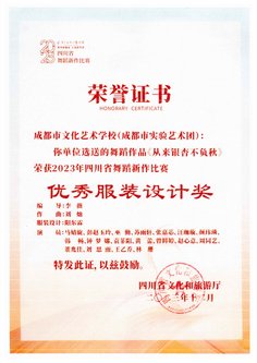 2023年12月,群舞《从来银杏不负秋》获四川省舞蹈新作比赛表演一等奖和优秀服装设计奖;