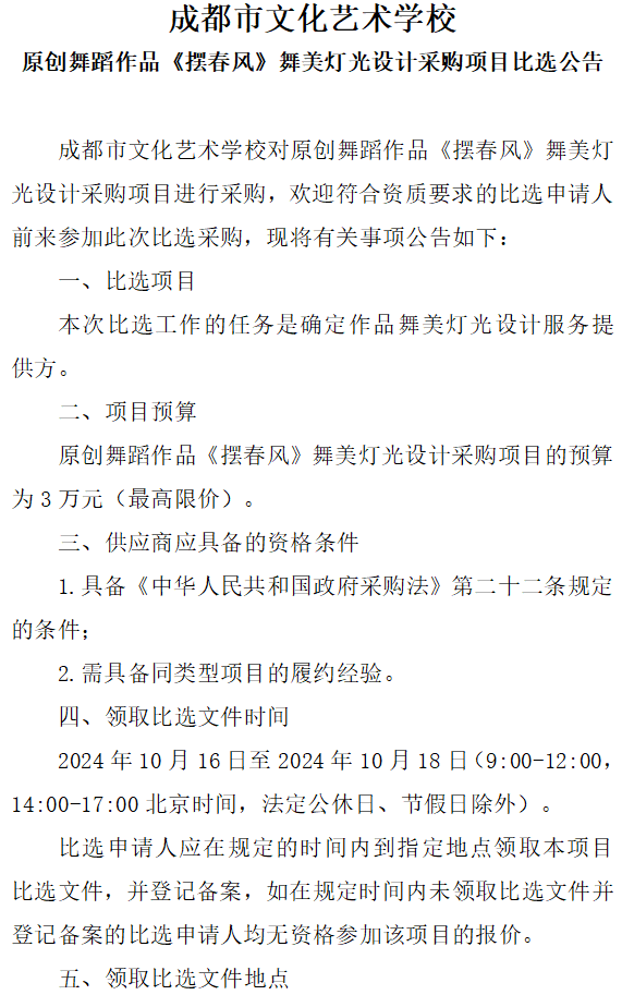 比选公告(原创舞蹈作品《摆春风》舞美灯光设计)