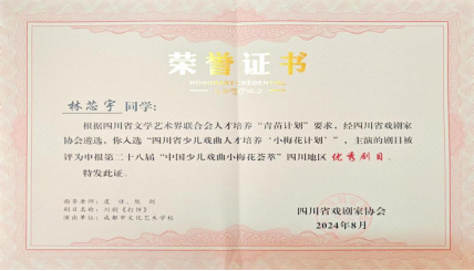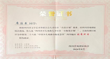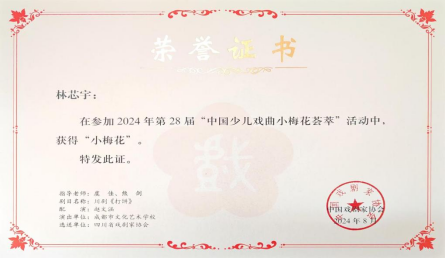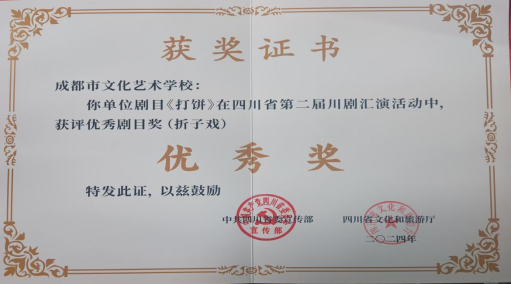 5.2024年8月,川剧《打饼》参加2024年第28届“中国少儿戏曲小梅花荟萃”活动获“小梅花”奖;