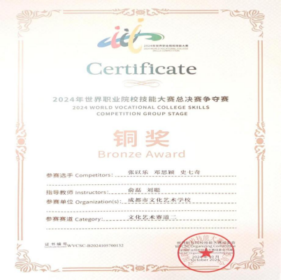 6.2024年10月,男子群舞《说唱俑》获2024年世界职业院校技能大赛总决赛争夺赛(文化艺术赛道二)铜奖;
