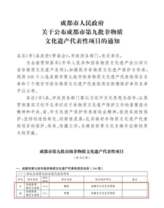 10.2024年12月,杂技节目《蹬技》《草帽》入选成都市第九批非物质文化遗产代表性项目。