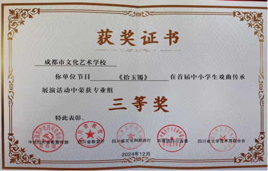 13.2024年12月,川剧《拾玉镯》获首届中小学生戏曲传承展演活动专业组三等奖;