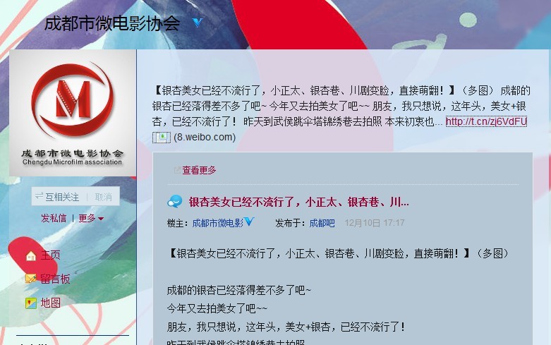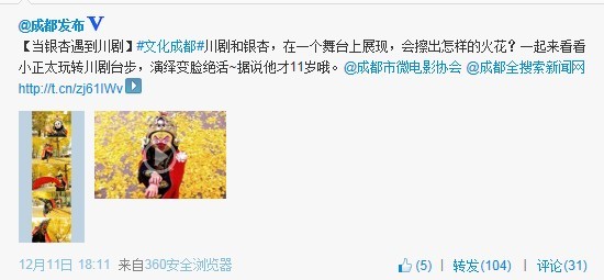 通过高速摄影机拍摄的“川剧变脸vs伞塔银杏”视频制作完成后,率先通过@成都市微电影协会 微博发布,随后,本网协调成都最大官方微博@成都发布 再次推荐,截至目前,转发上百次,获得网友一致好评。