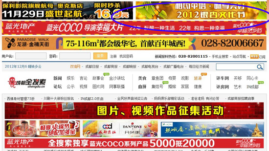 银杏节期间,配赠了成都全搜索新闻网首页刊例价4万8千元的广告位,连续不断刊发了为“2012银杏文化节”制作的广告图片,广告点击进入本次活动网络专题。同时,本网新闻列表首页对银杏节期间相关新闻报道进行重点推荐。