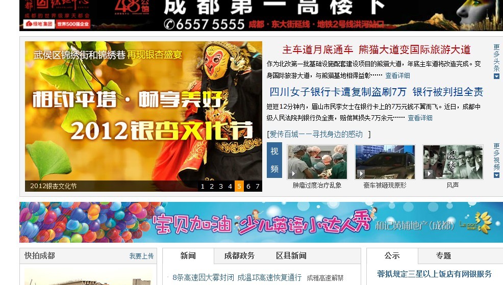 2012年12月5日起,成都全搜索新闻网通过网络专题、硬广、新闻报道、微博、论坛推广、全网论坛推广、四川成都手机报、创意视频等形式,对2012武侯银杏节进行了网络宣传推广,引导包括《成都日报》等传统媒体主动关注报道、成都最大的官方微博帐号@成都发布 参与推广,包括人民网、新华网等媒体转载新闻报道。同时,创意视频“今年银杏换个拍法——川剧变脸”获得网友一致好评。现将截至目前(12月13日)的有关情况总结 如下:
