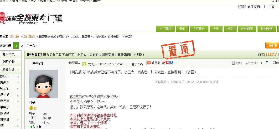 在成都全搜索龙门镇论坛发帖,秀出跳伞塔的银杏美图,活动期间,网帖在论坛首页进行推荐,并进行了全局置顶,截止目前,点击上万次。