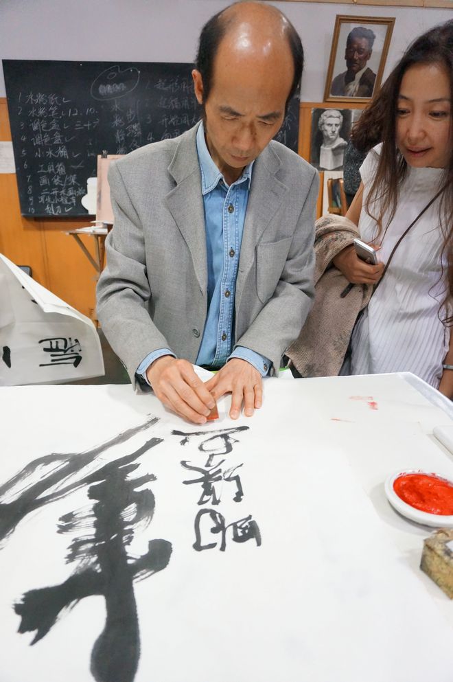 蔡寅坤欣然提笔,为美术班学生题字——“守勤”,以此勉励学生一日之计在于晨,一年之计在于春,珍惜时间。兴致勃勃的他还提笔写下“育人育己,教学教人”的书法作品。画罢,艺术家们意犹未尽,纷纷留下墨宝,鼓励学生们求学问道,要从以个人兴趣学习转化为坚持努力。蔡寅坤坦言,多年后重回母校,他看到了母校的变化,也看到了欣喜,看到了过去,更看到了未来。在母校的校园里,他感受到了母校的文韵、传统依旧,他的内心充满了无限感动与感激,他希望能够多回到母校与师生交流,弘扬中国优秀传统文化,真诚地祝福母校桃李满天下。