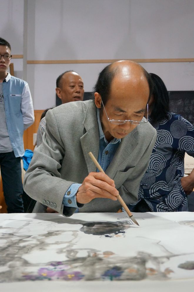 当天魏明阳首先挥毫作画,笔为主导,墨随心生。寥寥数笔,将两位老者坐而论道的场面描绘得跃然纸上;接着润畦调配出春意盎然的紫色彩墨,点点簇簇,随意挥洒,宣纸上仿佛开出了一片紫藤花,窗外洒进的一缕缕金色的阳光仿佛蒸出扑鼻而来的花香,春风拂过的摇曳场景美不胜收;随后蔡寅坤挥毫点睛,一向以大写意著称的他用自然的紫藤串起整幅大作,生机盎然。书法家徐建为作品题名“初春”,小款借用中国书法家陶博吾先生诗句“知识贯输重品德,好为时代育英才”。在创作过程中,老师们不时将作画心得和真谛传授给同学们。