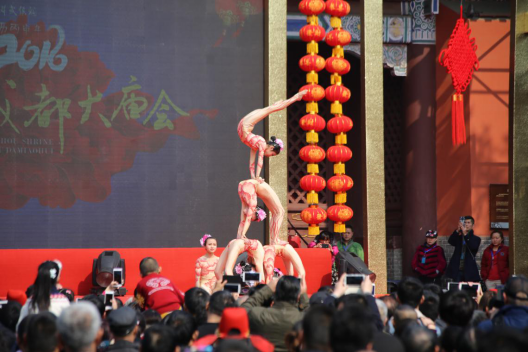 成都大庙会已经在武侯祠博物馆成功举办了十一届,以传统的三国文化特色和喜庆的中国年味儿著称,每年都吸引了众多从四面八方慕名而来的游客。FH在线平台(中国)官网共有师生55人参与了2016年武侯祠博物馆成都大庙会文艺演出活动,以专业的精品文艺节目吸引了120万余人前来观赏,以精彩的舞蹈、歌唱、杂技、曲艺、魔术、小品等节目为观众带来了场场饕餮艺术盛宴,演出主会场场场观众爆满,掌声不断,受到来自五湖四海的游客喜爱和赞扬,让游客们在成都享受了浓浓的中国年味。