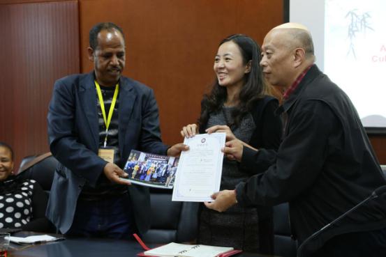 为期10天的培训,从课堂到参观学习都安排得满满当当的,内容十分丰富。对非洲非遗官员及非遗专家而言,实在太短了。但他们非常珍惜培训的学习机会,不光在课堂有提不完的问题,就是走到哪里,也要“十万个为什么”,充分体现了他们敏而好学的精神。在结业座谈总结会上,非洲朋友落落大方,更是侃侃而谈;有时会做出夸张的动作,表情与手势极为丰富,会上不是发出爽朗的笑声和热烈的鼓掌。张晓俊校长为每位学员颁发结业证书时,他们更是高兴得手舞足蹈,甚至有人从嘴里发出尖锐的哨音。