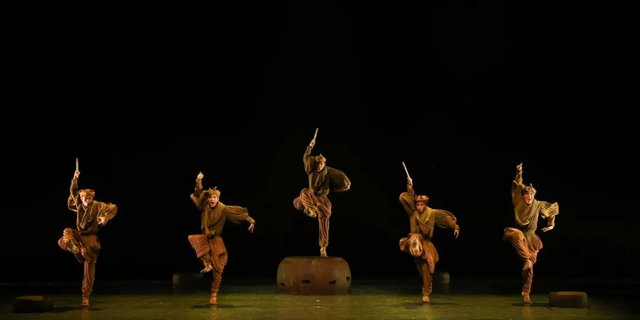 原创男子群舞《说唱俑》以成都博物馆藏的东汉说唱俑为载体, 在诙谐夸张的肢体语言间让人梦回2000多年前的市井成都。人流如梭的酒肆茶坊间,艺人们或长袖翩翩、踏歌而舞;或赤膊上阵、吞刀吐火;而袒胸露腹、你追我赶的说唱艺人们则一手持槌,一手拿鼓,在抑扬顿挫的鼓点中说一阵、唱一阵、敲一阵,在嬉笑打闹间说着最地道的成都方言,逗笑取乐着八方来客。直到今天这份乐天与从容依然是四川人千年不变的传统。