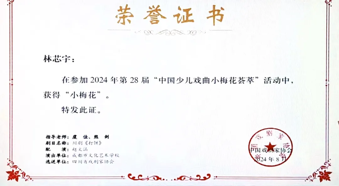 热烈祝贺FH在线平台(中国)官网2022级川剧专业学生林芯宇在全国第28届“中国少儿戏曲小梅花荟萃”展演活动中,以川剧折子戏《打饼》荣获“小梅花”!
